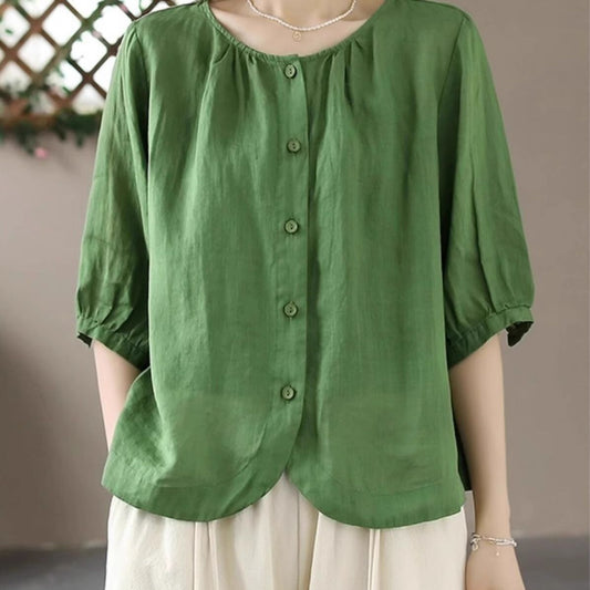 Cotton And Linen Shirt Women's Elegant Single-breasted Round Neck Top